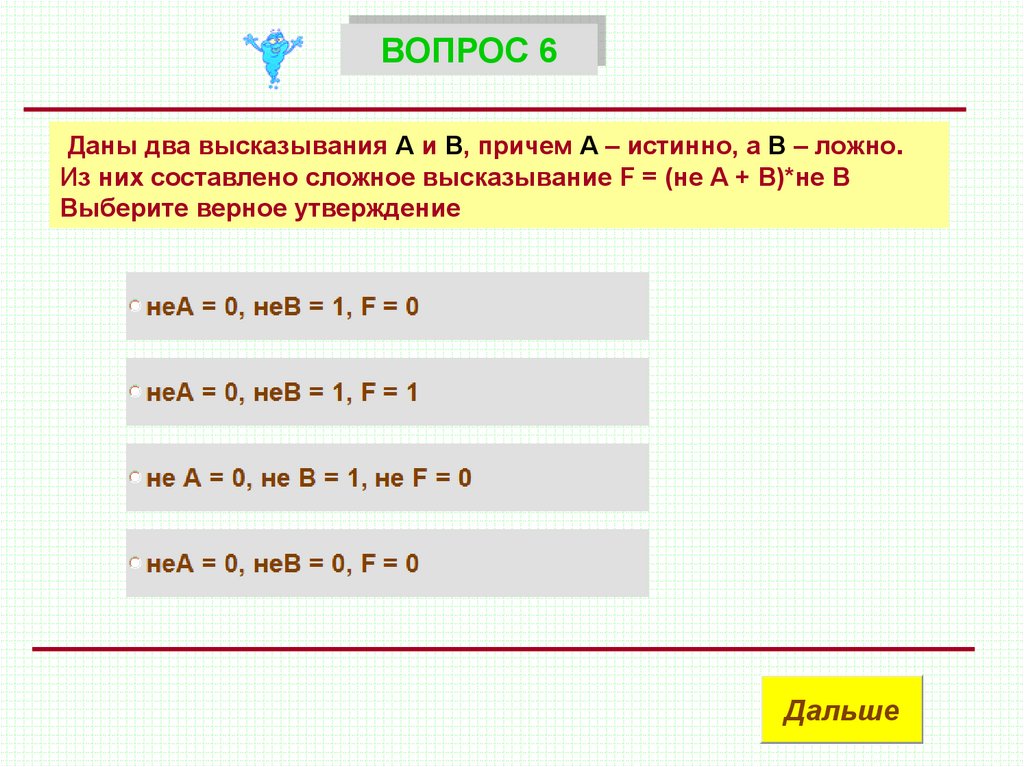 ВОПРОС 6Даны два высказывания А и В, причем А – истинно, а В – ложно.