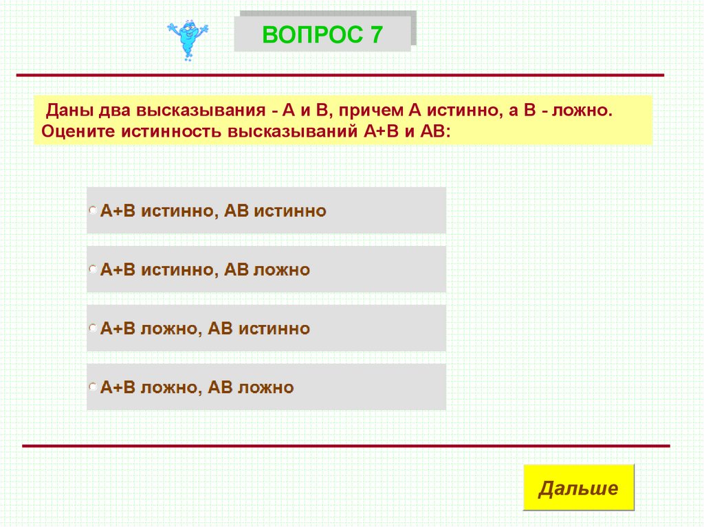 ВОПРОС 7Даны два высказывания - А и В, причем А истинно, а В - ложно.
