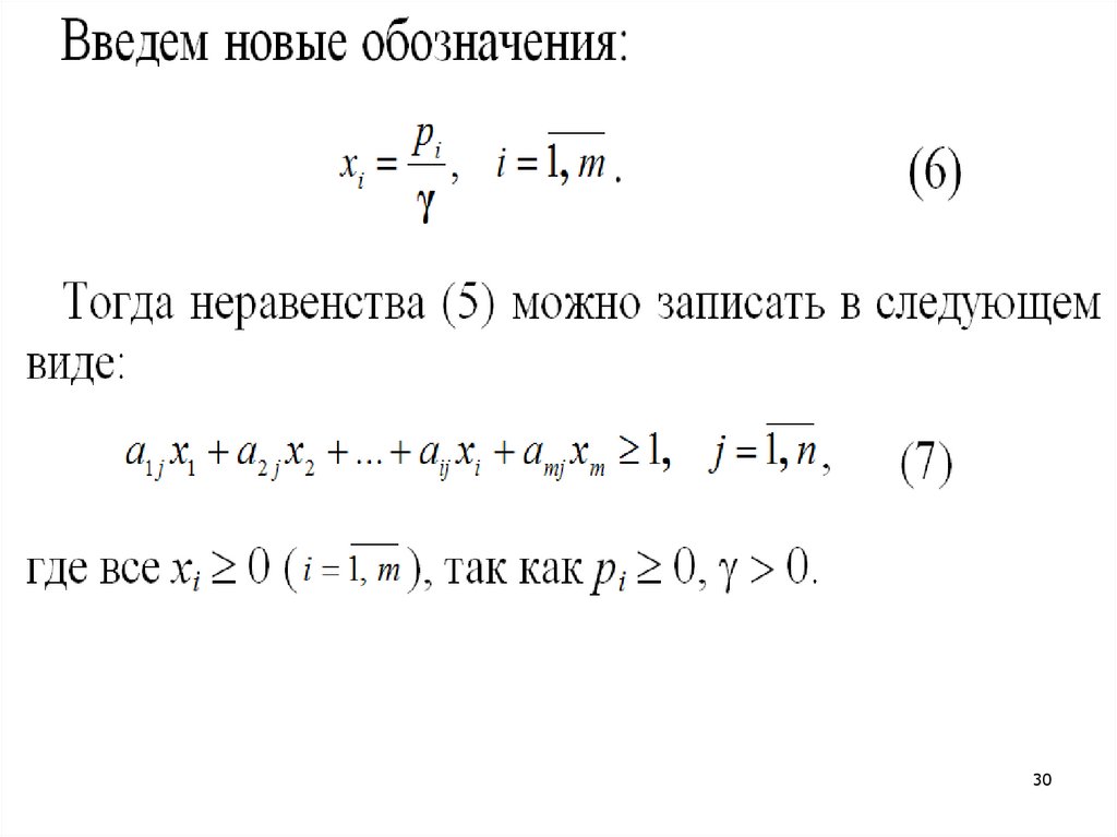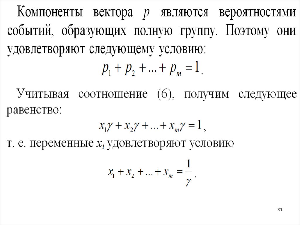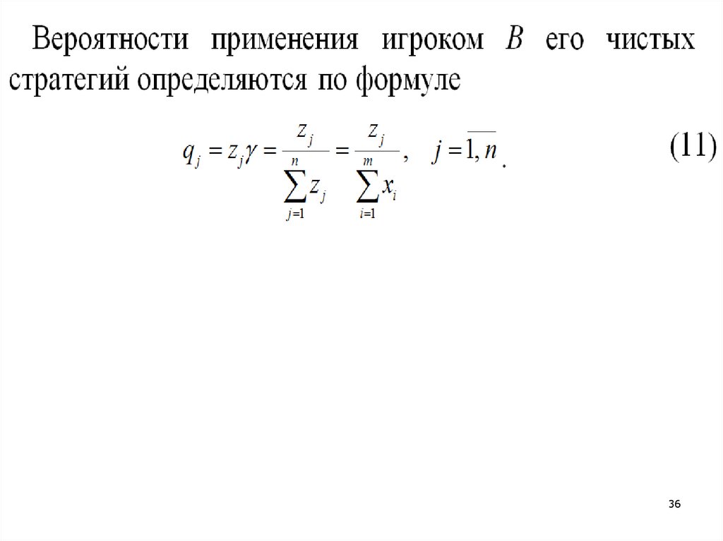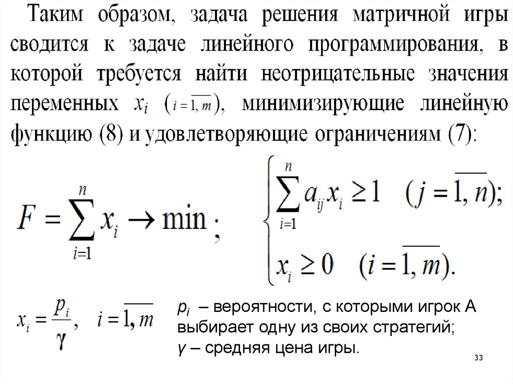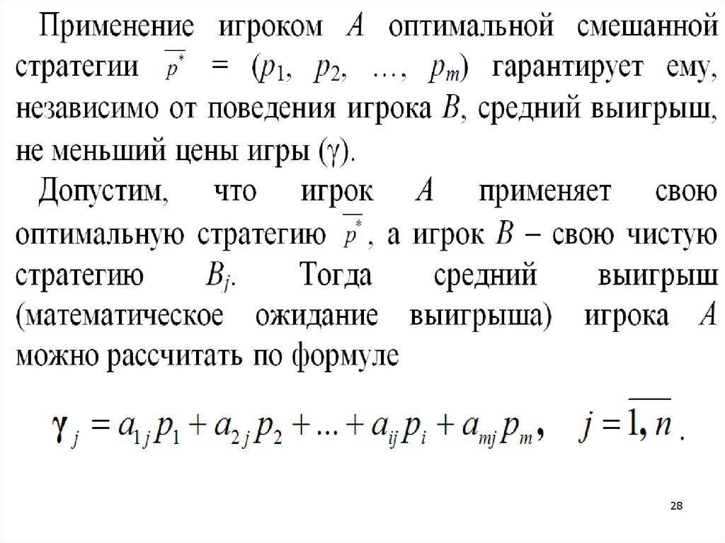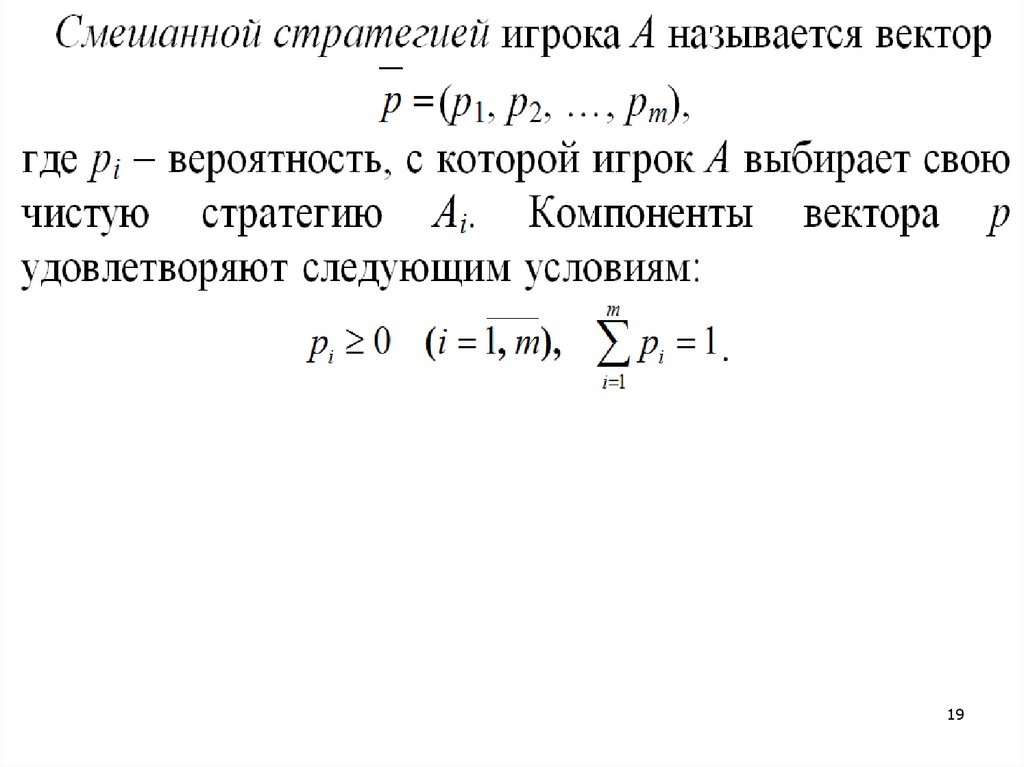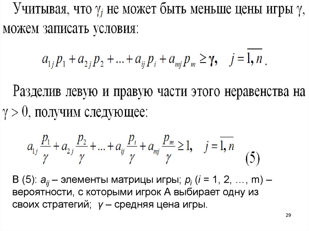 В (5): aij – элементы матрицы игры; pi (i = 1, 2, …, m) –вероятности, с которыми игрок А выбирает одну из