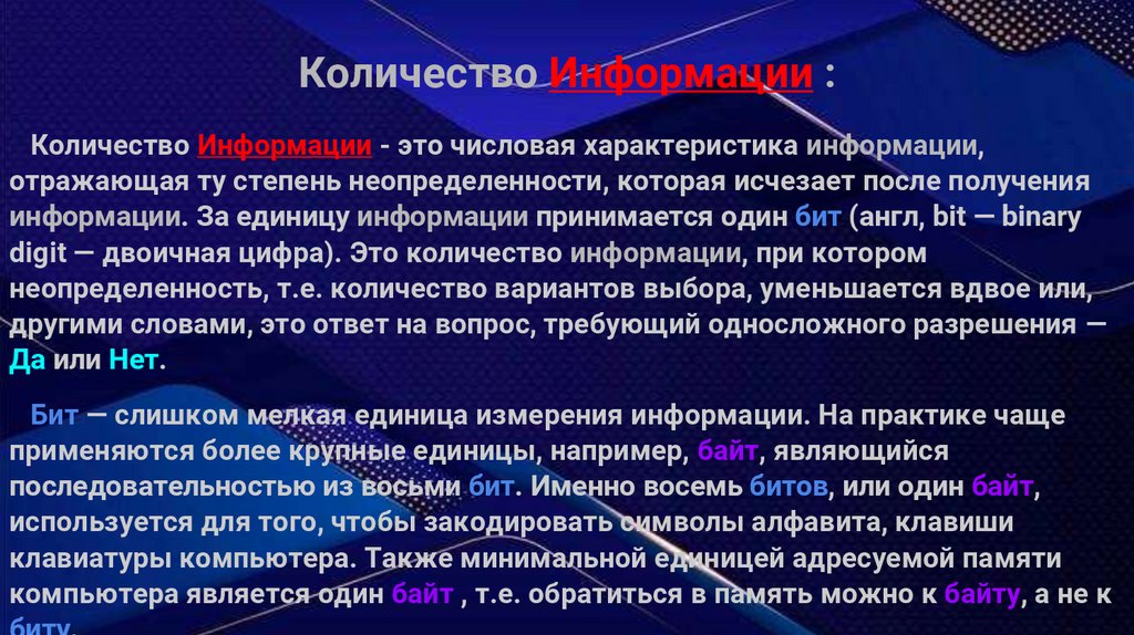 информации. За единицу информации принимается один бит (англ, bit — binary