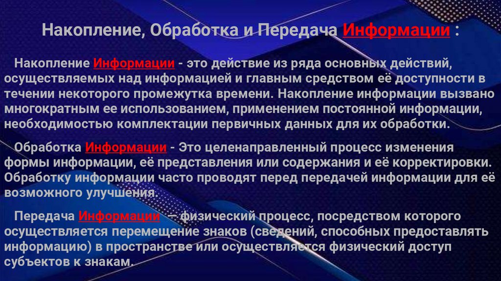 Накопление, Обработка и Передача Информации :Накопление Информации - это действие из ряда основных действий,