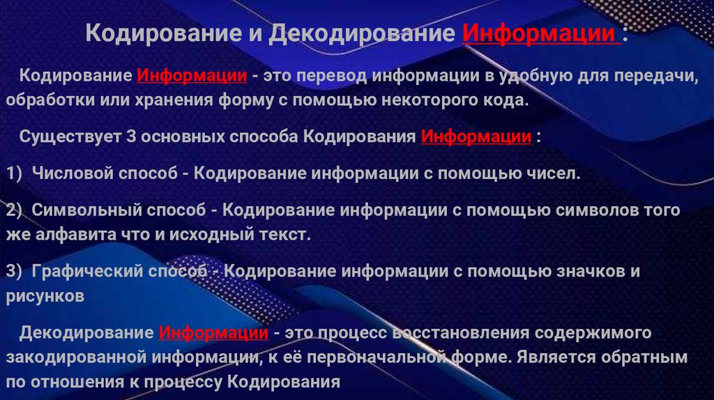 Кодирование и Декодирование Информации :Кодирование Информации - это перевод информации в удобную для передачи,