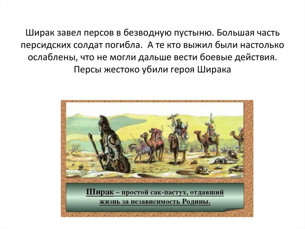 Ширак завел персов в безводную пустыню. Большая частьперсидских солдат погибла. А те кто выжил были настолько