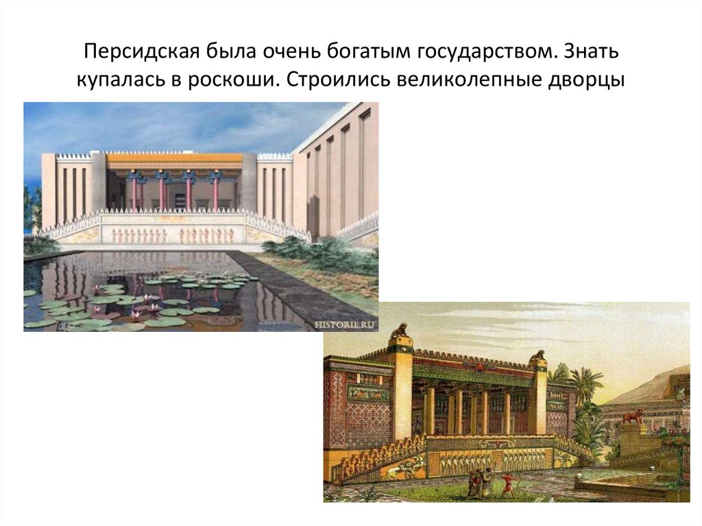 Персидская была очень богатым государством. Знатькупалась в роскоши. Строились великолепные дворцы