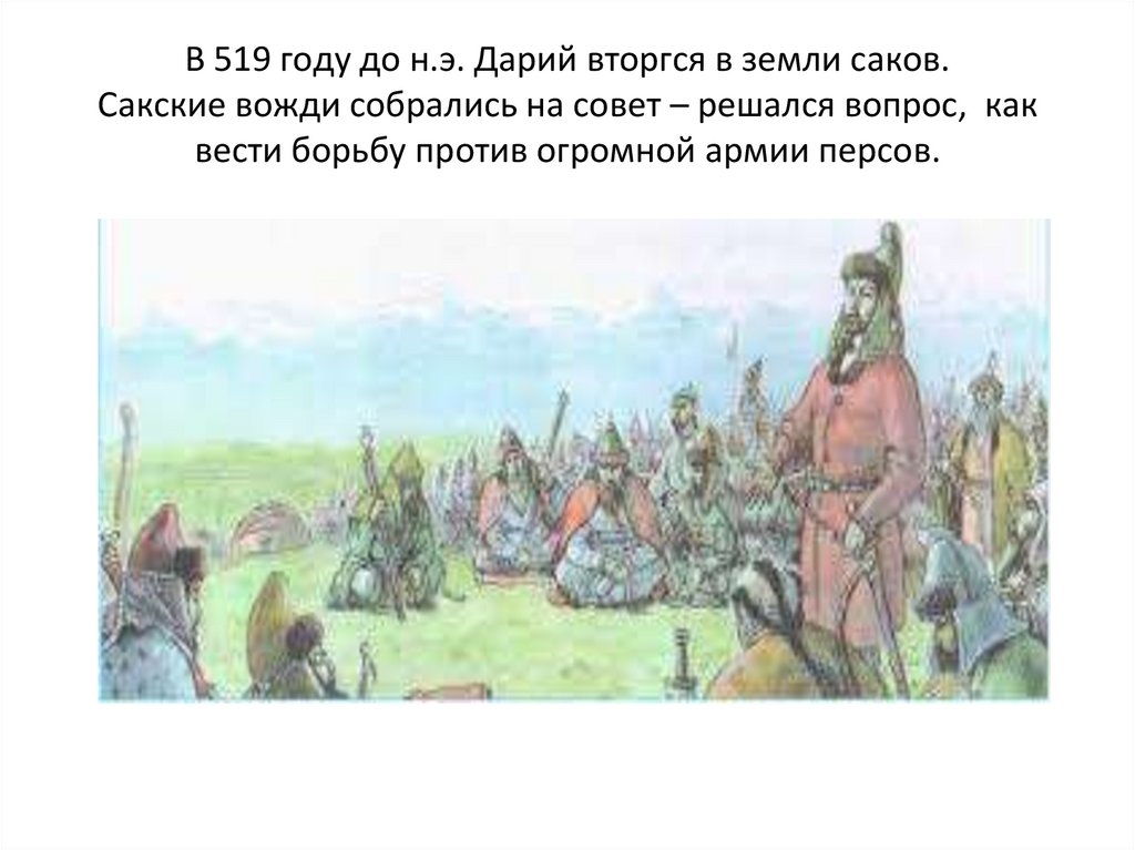 В 519 году до н.э. Дарий вторгся в земли саков.Сакские вожди собрались на совет – решался вопрос, как