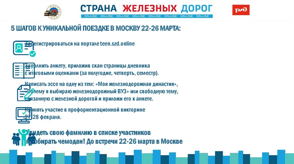 5 ШАГОВ К УНИКАЛЬНОЙ ПОЕЗДКЕ В МОСКВУ 22-26 МАРТА:Зарегистрироваться на портале teen.szd.online