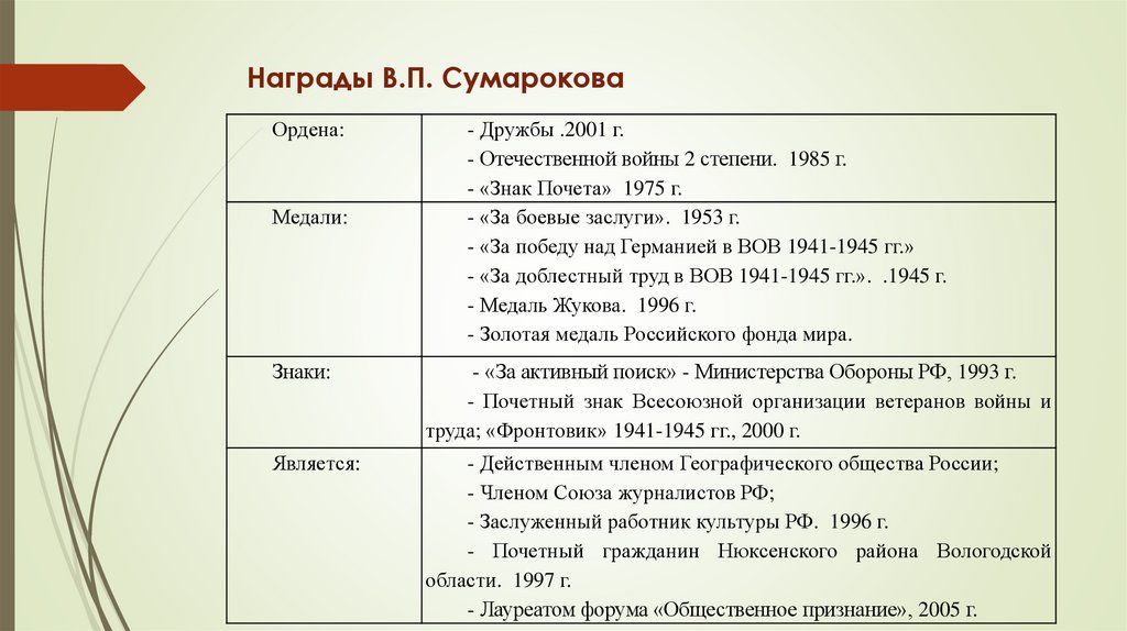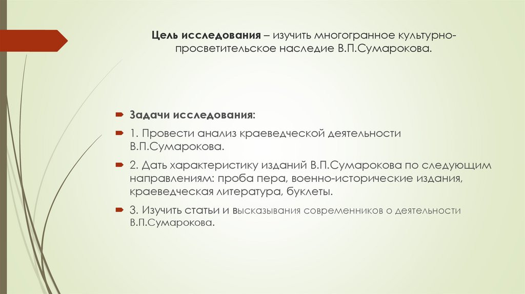 Цель исследования – изучить многогранное культурнопросветительское наследие В.П.Сумарокова.Задачи исследования: