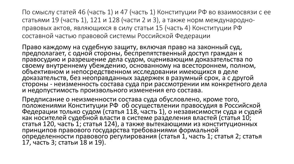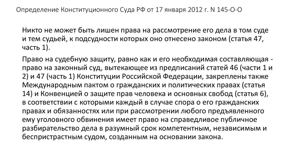 часть 1) и закрепляет право на законный суд, предполагающее, что никто не