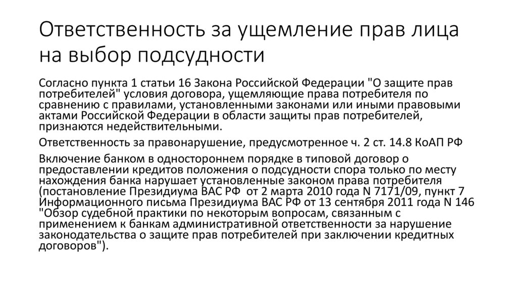 Ответственность за ущемление прав лицана выбор подсудности