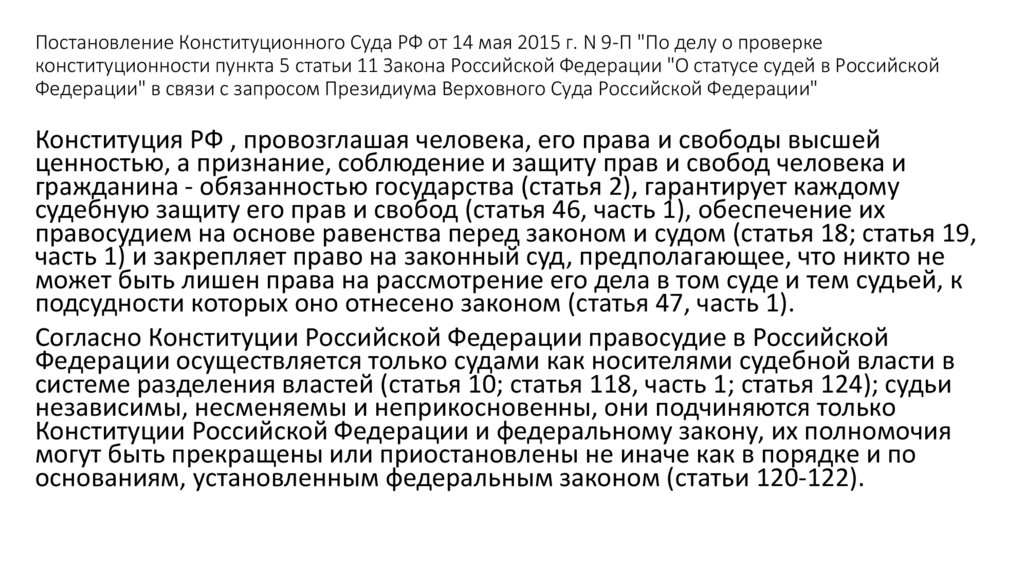 Постановление Конституционного Суда РФ от 14 мая 2015 г. N 9-П "По делу о проверкеконституционности пункта 5 статьи 11 Закона Российской Федерации "О статусе судей в Российской