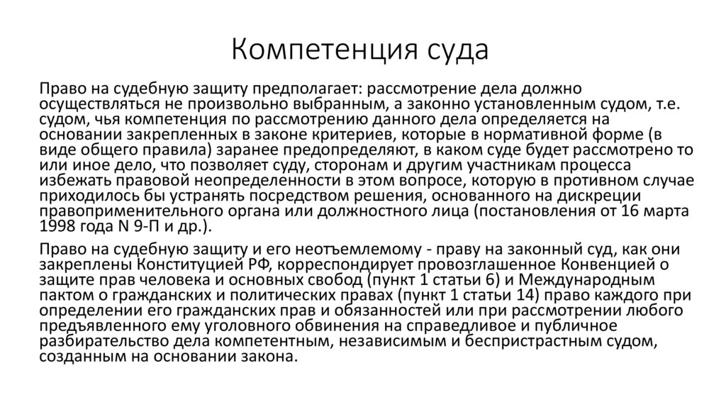Компетенция судаПраво на судебную защиту предполагает: рассмотрение дела должно