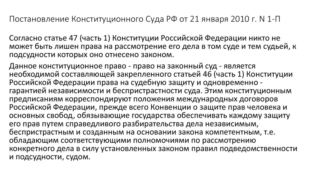 Постановление Конституционного Суда РФ от 21 января 2010 г. N 1-ПСогласно статье 47 (часть 1) Конституции Российской Федерации никто не