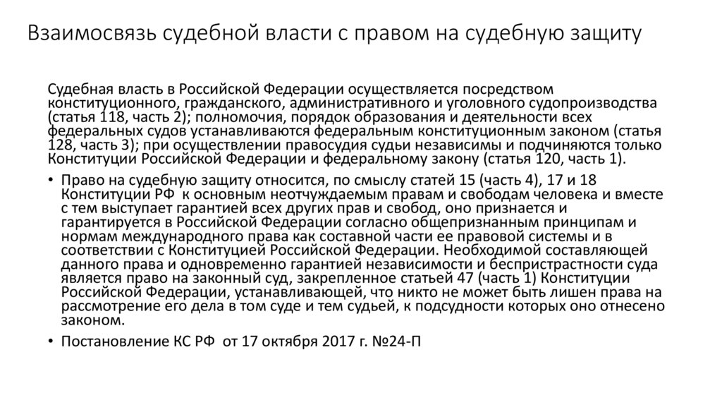 Взаимосвязь судебной власти с правом на судебную защитуСудебная власть в Российской Федерации осуществляется посредством