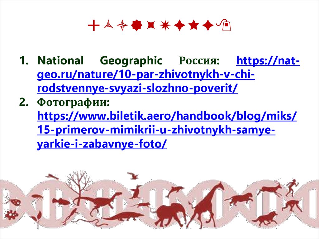 1. National Geographic Россия: https://natgeo.ru/nature/10-par-zhivotnykh-v-chirodstvennye-svyazi-slozhno-poverit/2. Фотографии: