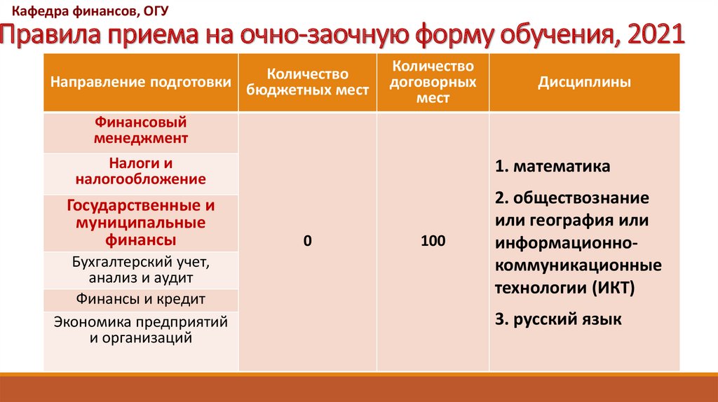 Кафедра финансов, ОГУПравила приема на очно-заочную форму обучения, 2021