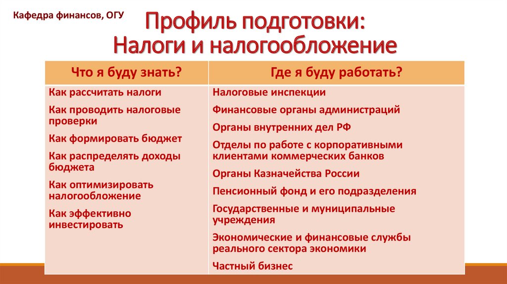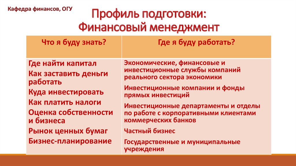 Кафедра финансов, ОГУПрофиль подготовки: