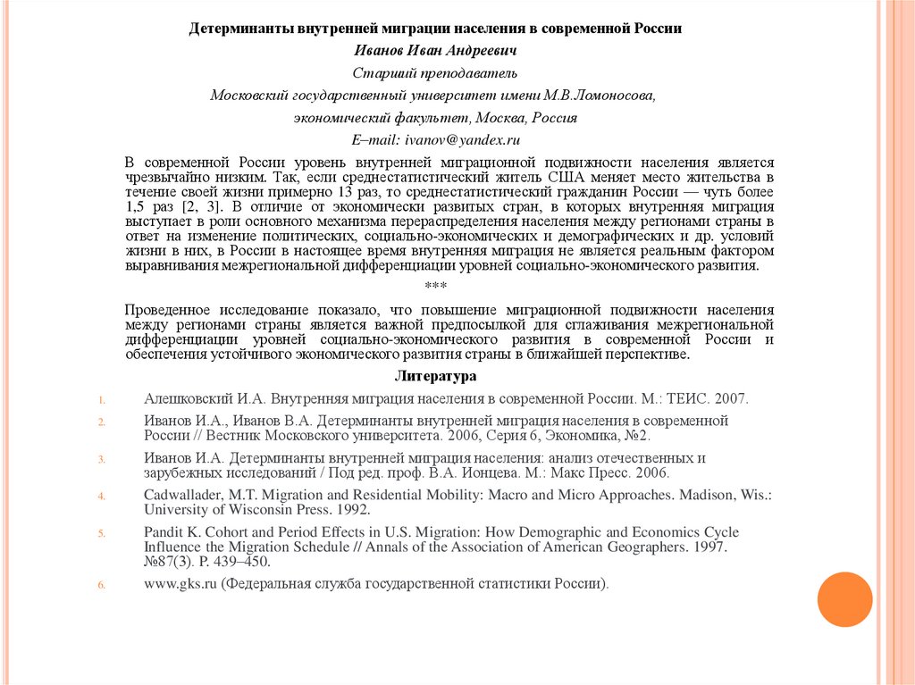 Иванов И.А. Детерминанты внутренней миграция населения: анализ отечественных и