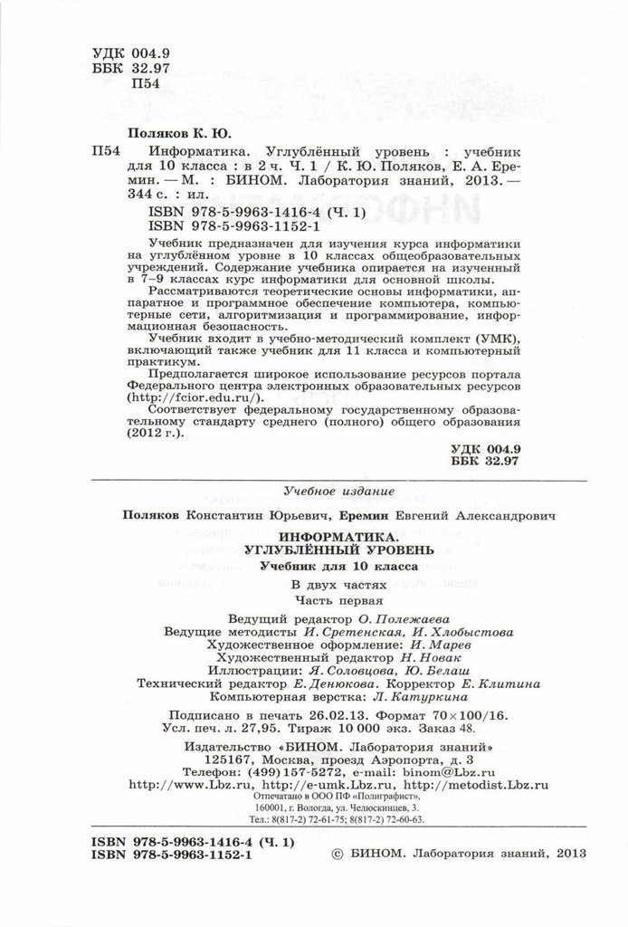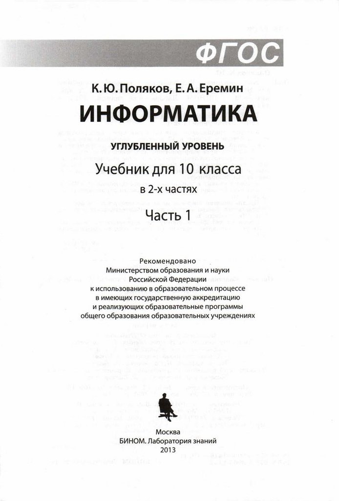 К.Ю. Поляков, Е. А. Еремин. Информатика. Углубленный уровень. Учебник для 10 класса в 2-х частях. Часть 1