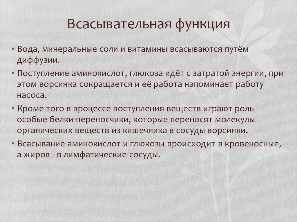 Всасывательная функция• Вода, минеральные соли и витамины всасываются путём