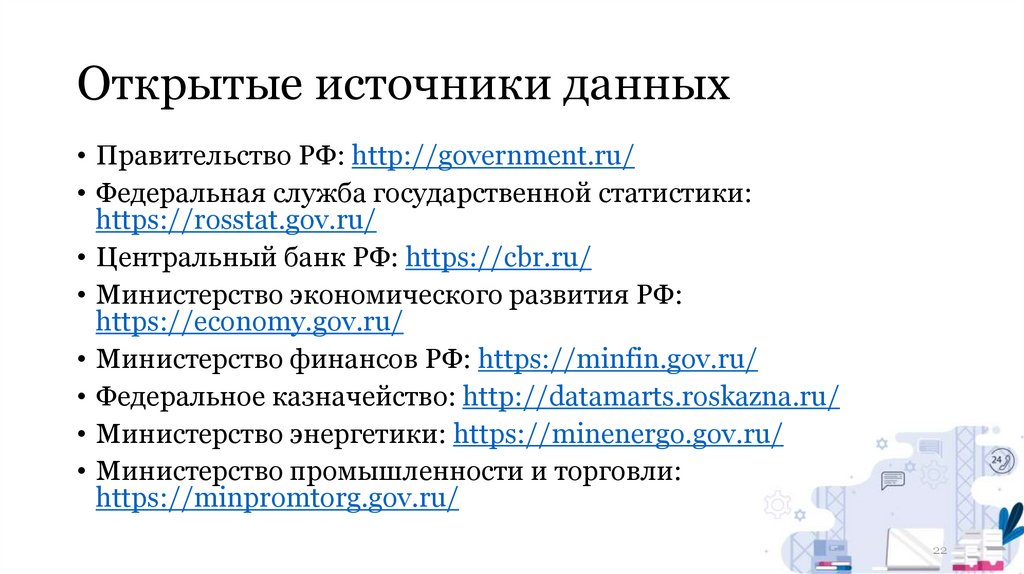Открытые источники данных• Правительство РФ: http://government.ru/
