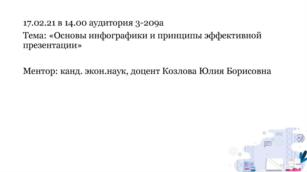 17.02.21 в 14.00 аудитория 3-209аТема: «Основы инфографики и принципы эффективной