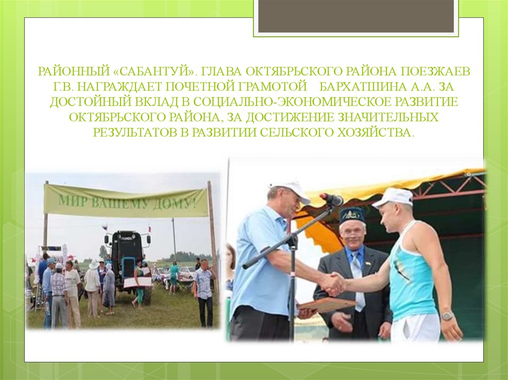 РАЙОННЫЙ «САБАНТУЙ». ГЛАВА ОКТЯБРЬСКОГО РАЙОНА ПОЕЗЖАЕВГ.В. НАГРАЖДАЕТ ПОЧЕТНОЙ ГРАМОТОЙ БАРХАТШИНА А.А. ЗА