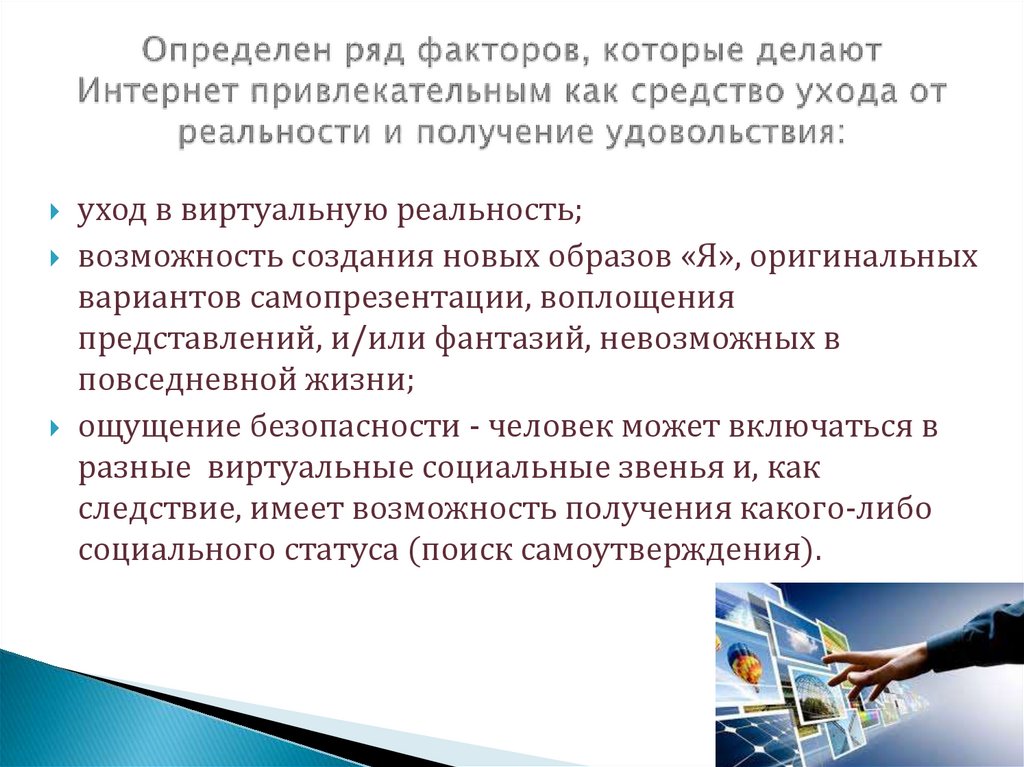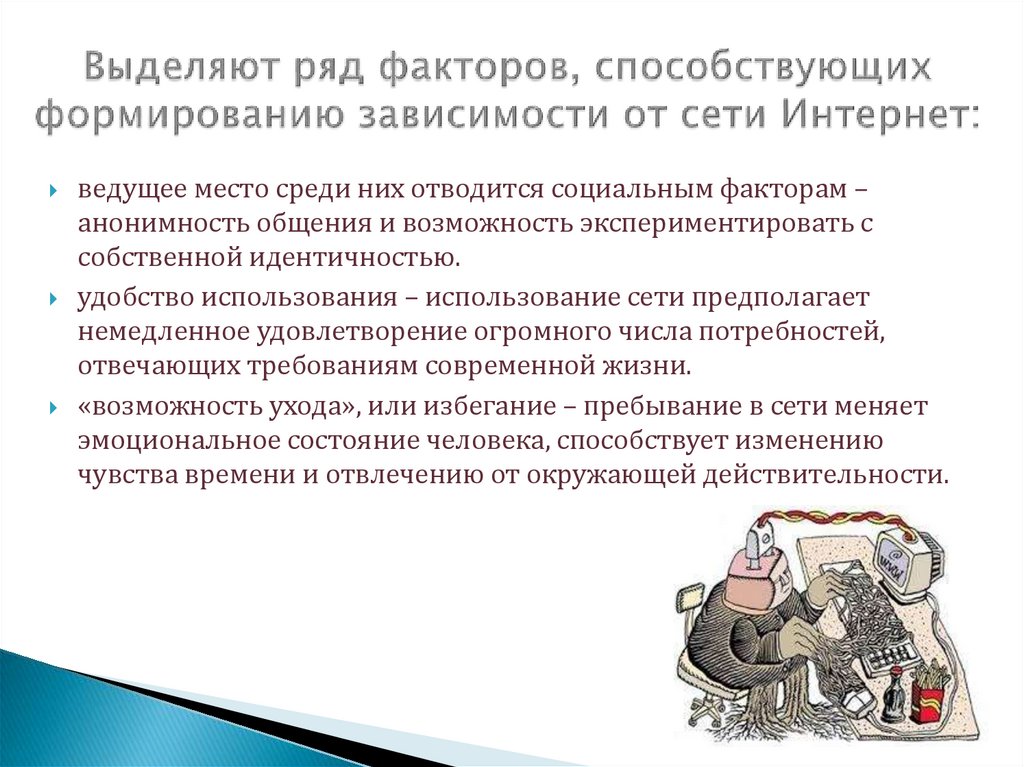 ведущее место среди них отводится социальным факторам –анонимность общения и возможность экспериментировать с