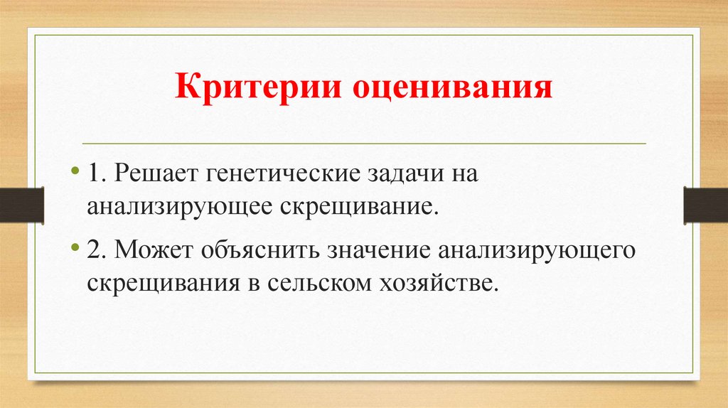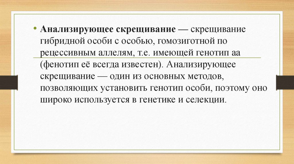 • Анализирующее скрещивание — скрещиваниегибридной особи с особью, гомозиготной по