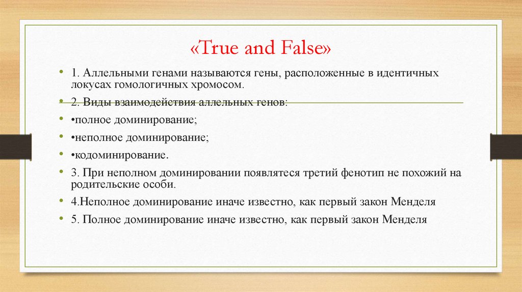 «True and False»• 1. Аллельными генами называются гены, расположенные в идентичных