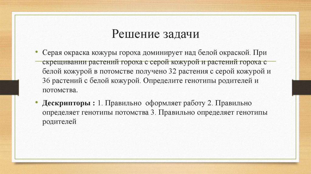Решение задачи• Серая окраска кожуры гороха доминирует над белой окраской. При