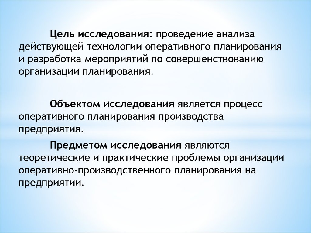 Цель исследования: проведение анализадействующей технологии оперативного планирования