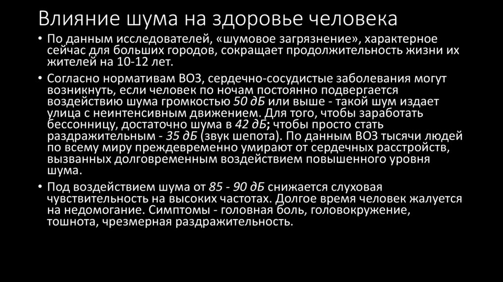 Влияние шума на здоровье человека• По данным исследователей, «шумовое загрязнение», характерное