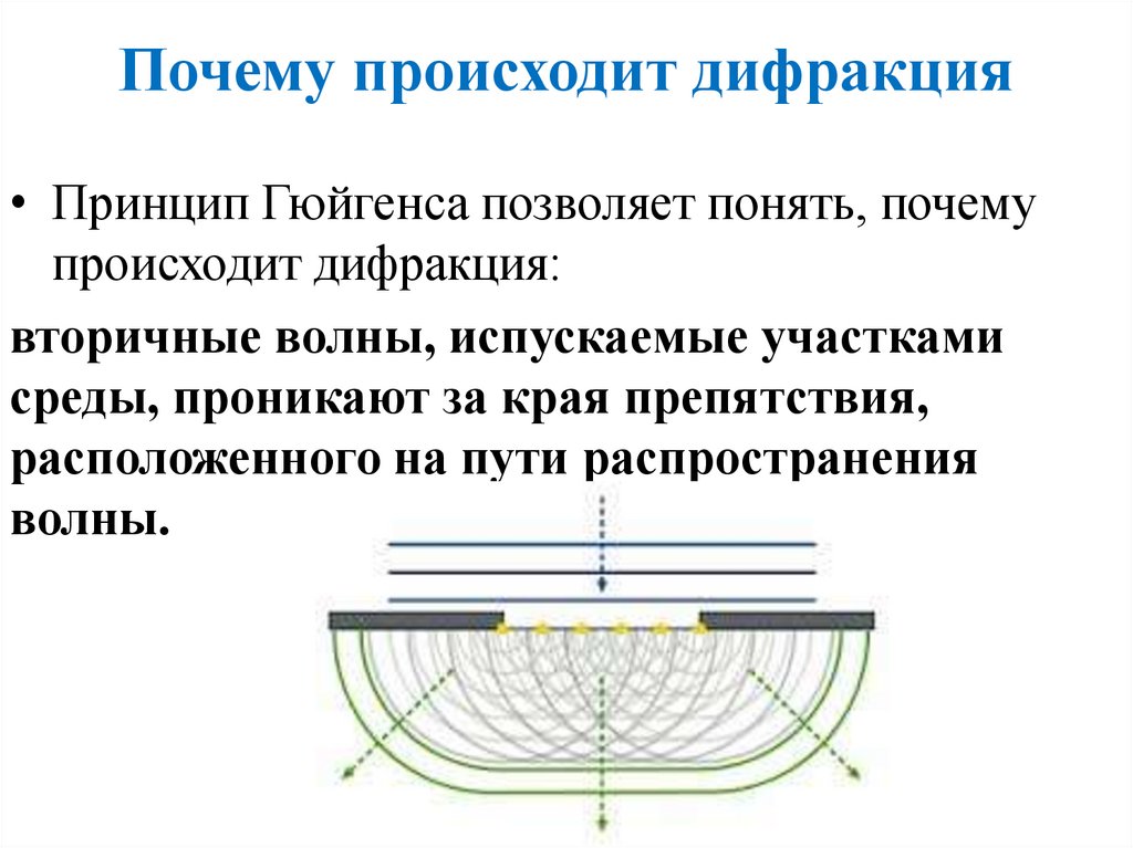 Почему происходит дифракция• Принцип Гюйгенса позволяет понять, почему
