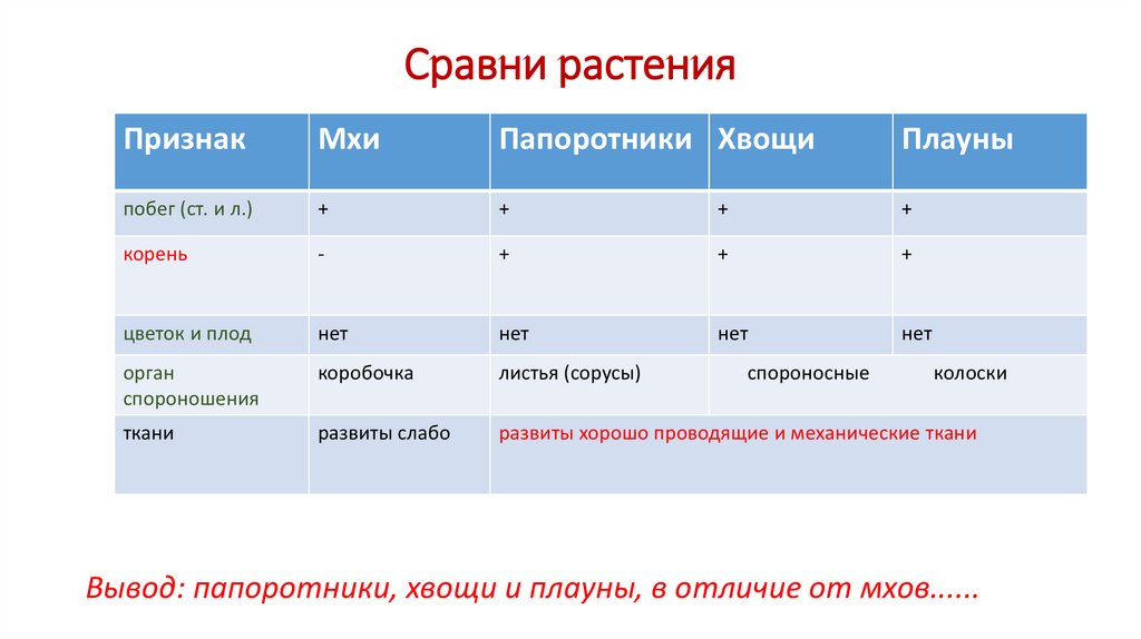 Вывод: папоротники, хвощи и плауны, в отличие от мхов......