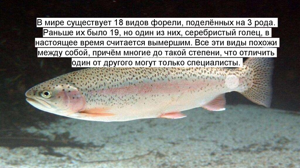В мире существует 18 видов форели, поделённых на 3 рода.Раньше их было 19, но один из них, серебристый голец, в