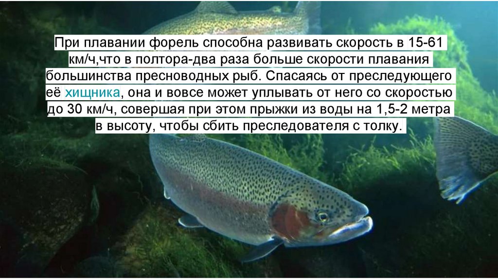 При плавании форель способна развивать скорость в 15-61км/ч,что в полтора-два раза больше скорости плавания