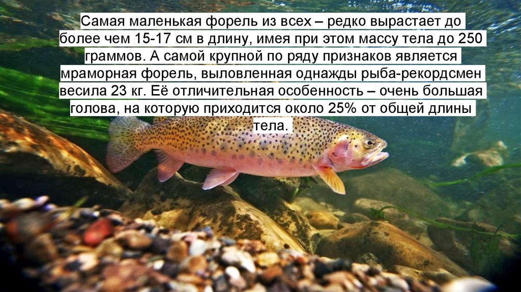 Самая маленькая форель из всех – редко вырастает доболее чем 15-17 см в длину, имея при этом массу тела до 250
