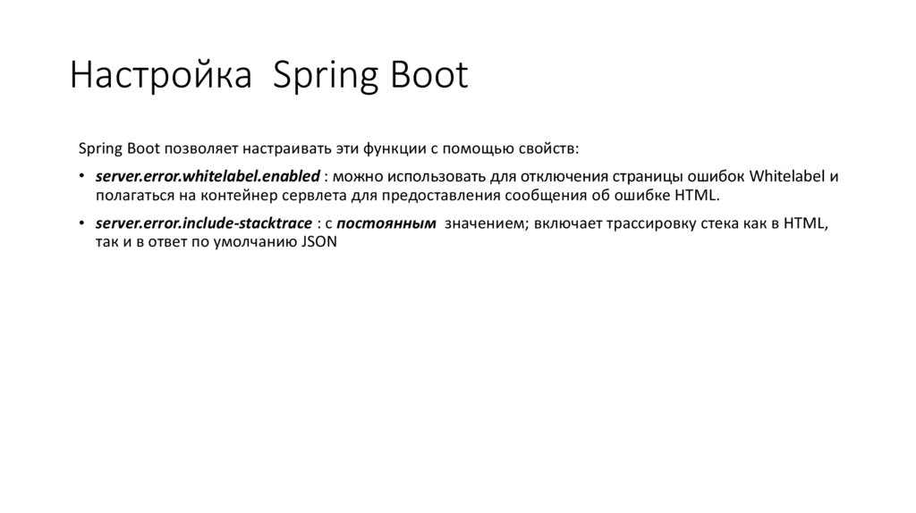 • server.error.whitelabel.enabled : можно использовать для отключения страницы ошибок Whitelabel и
