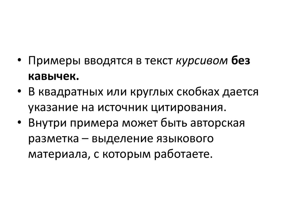 • Примеры вводятся в текст курсивом безкавычек.