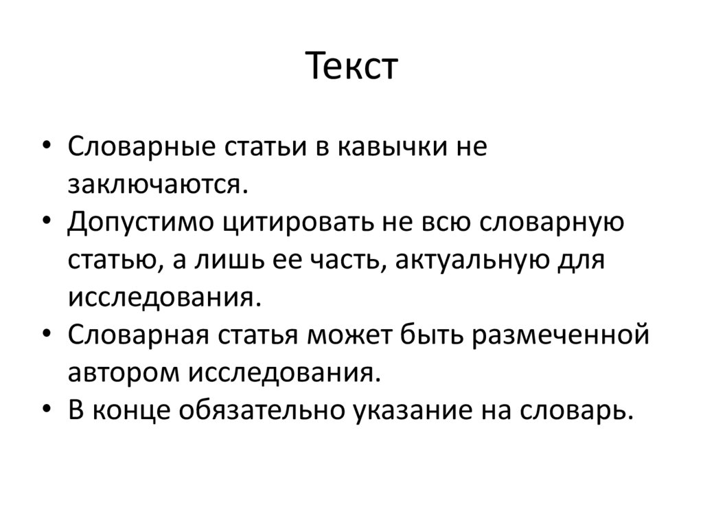 Текст• Словарные статьи в кавычки не