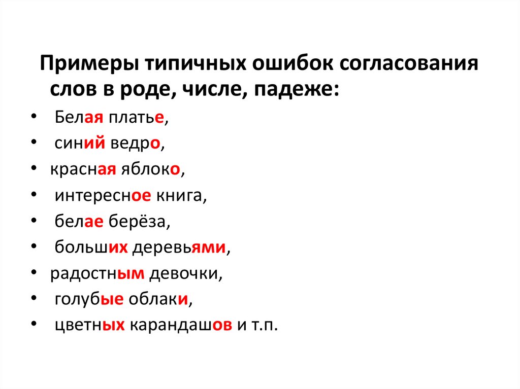 Примеры типичных ошибок согласованияслов в роде, числе, падеже: