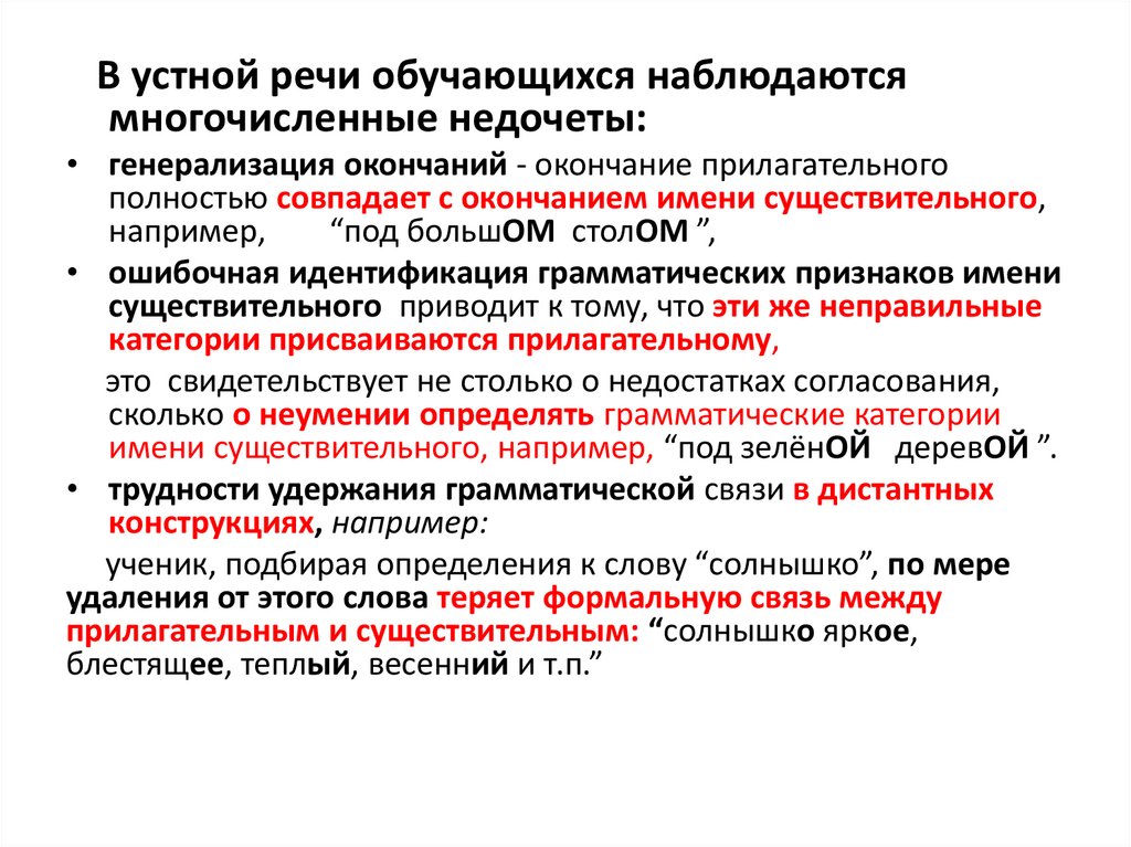 В устной речи обучающихся наблюдаютсямногочисленные недочеты: