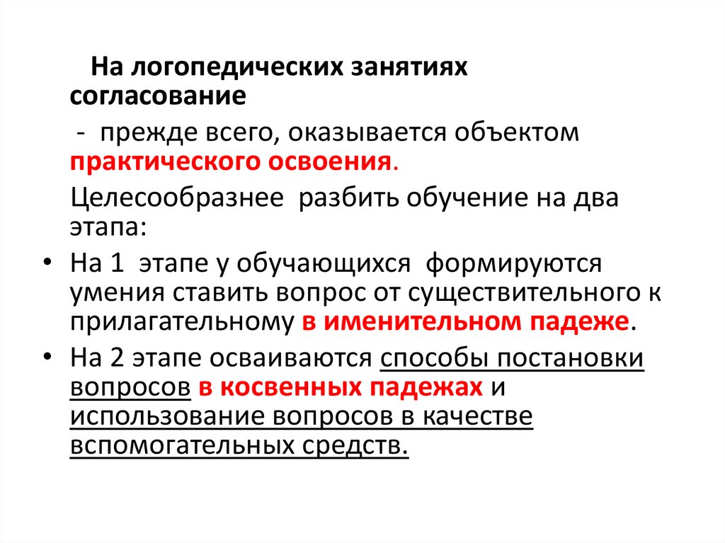 Обучение согласованию различных частейречи следует начинать