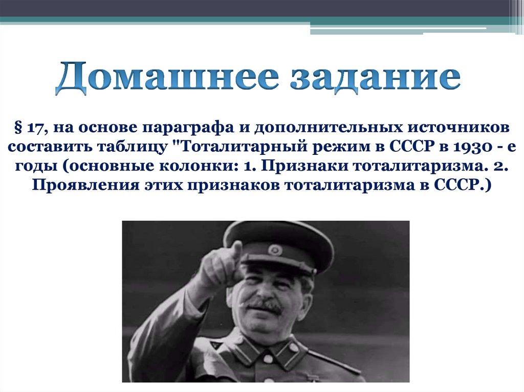 § 17, на основе параграфа и дополнительных источниковсоставить таблицу "Тоталитарный режим в СССР в 1930 - е