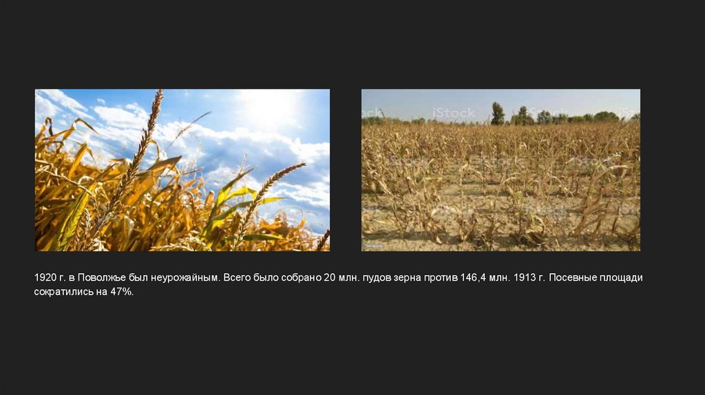 1920 г. в Поволжье был неурожайным. Всего было собрано 20 млн. пудов зерна против 146,4 млн. 1913 г. Посевные площадисократились на 47%.