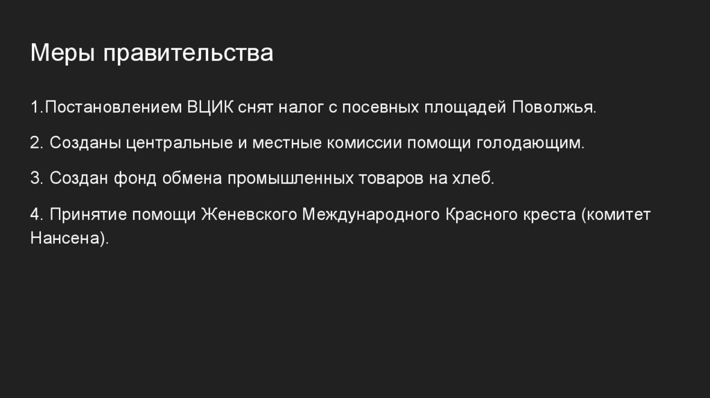 Меры правительства1.Постановлением ВЦИК снят налог с посевных площадей Поволжья.