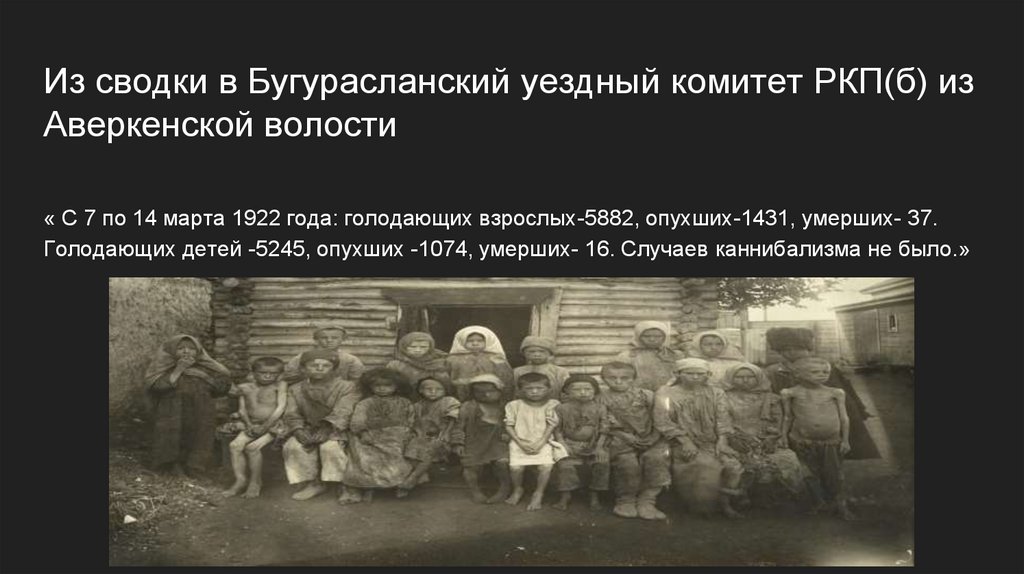 Голодающих детей -5245, опухших -1074, умерших- 16. Случаев каннибализма не было.»