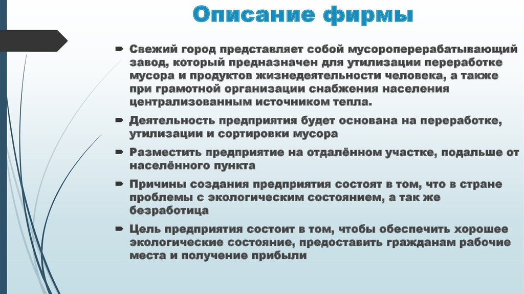 Описание фирмыСвежий город представляет собой мусороперерабатывающий