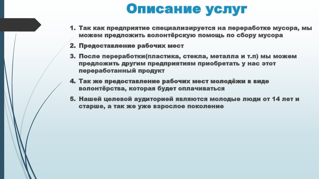 Описание услуг1. Так как предприятие специализируется на переработке мусора, мы