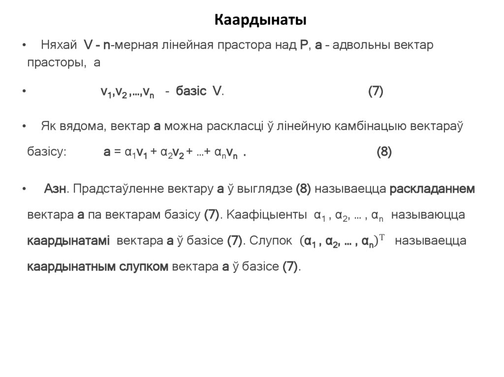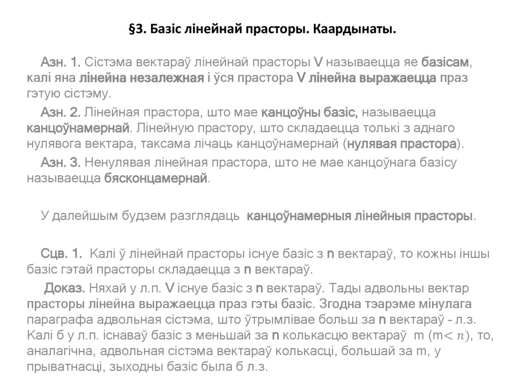 §3. Базіс лінейнай прасторы. Каардынаты.Азн. 1. Сістэма вектараў лінейнай прасторы V называецца яе базісам,